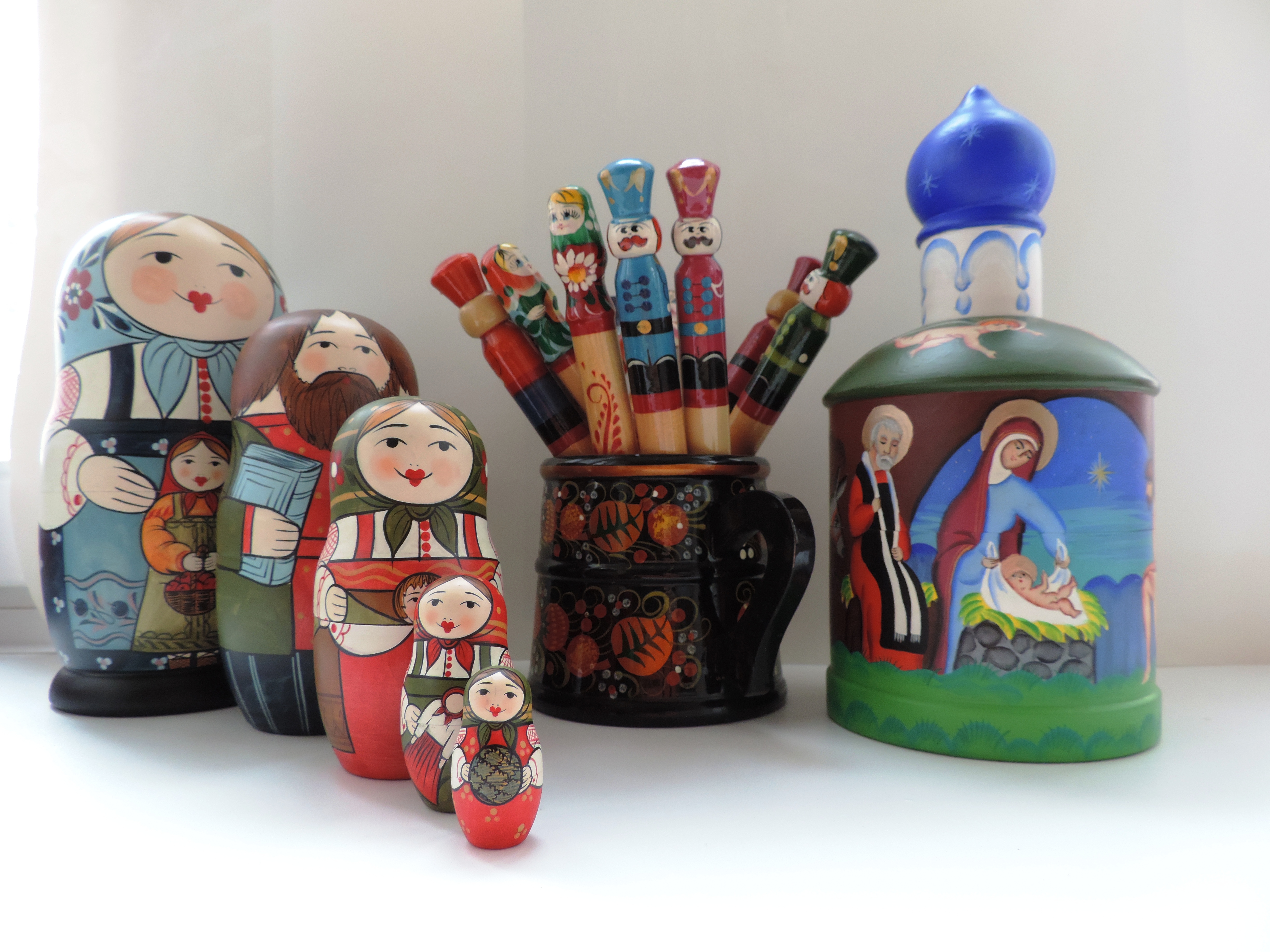 "Matriochka" traditionnelles, crèches de Noël, souvenirs, linge.